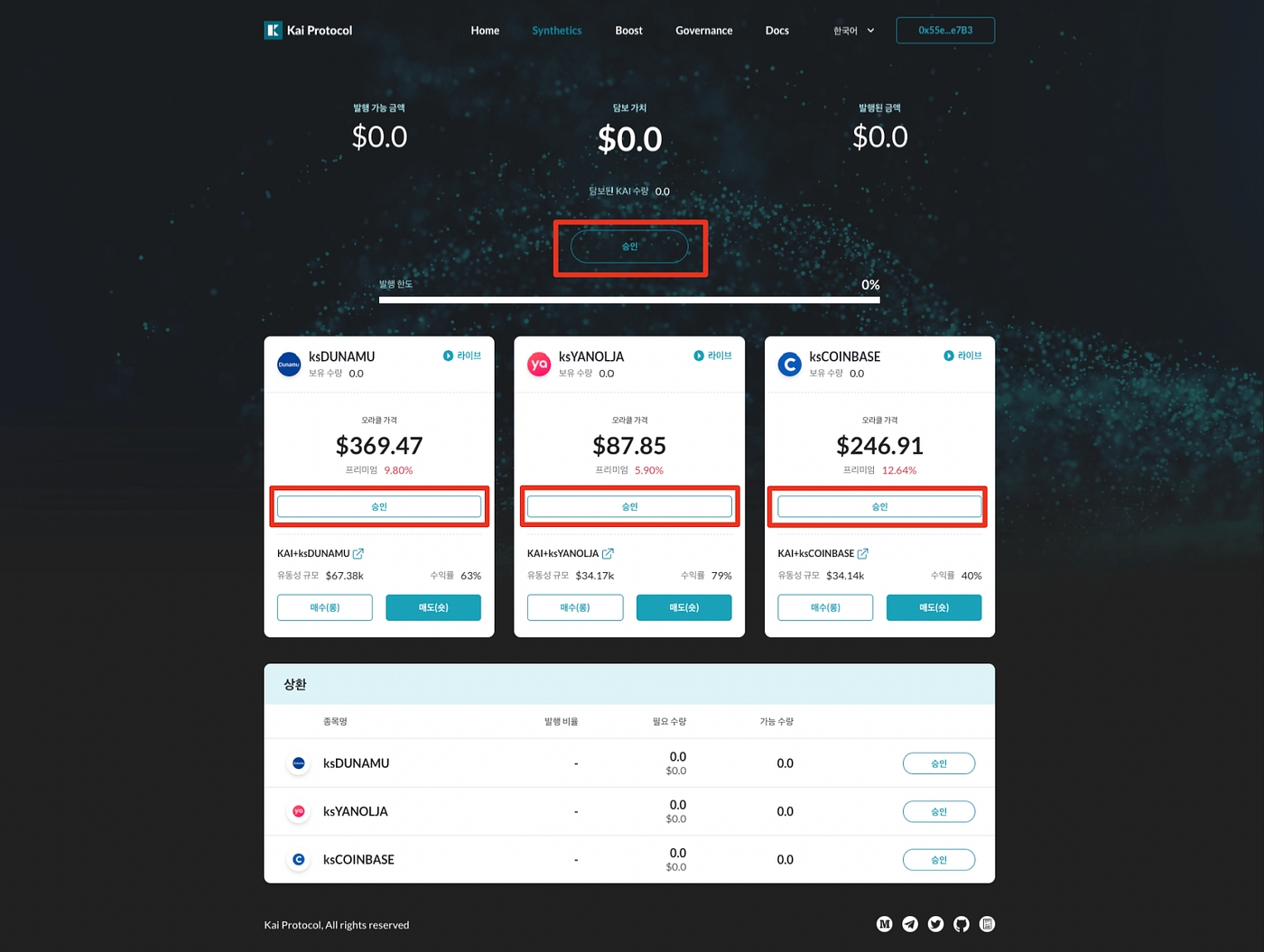 메뉴에서 Synthetics 접속 시 담보 예치, 각 합성자산 컨트랙트 [승인]이 필요합니다.