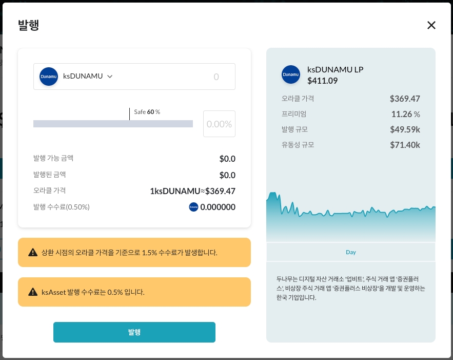 2. 발행 가능 금액 내에서 발행량을 입력하고 [발행] 버튼을 클릭하면, 해당 합성자산이 발행됩니다.