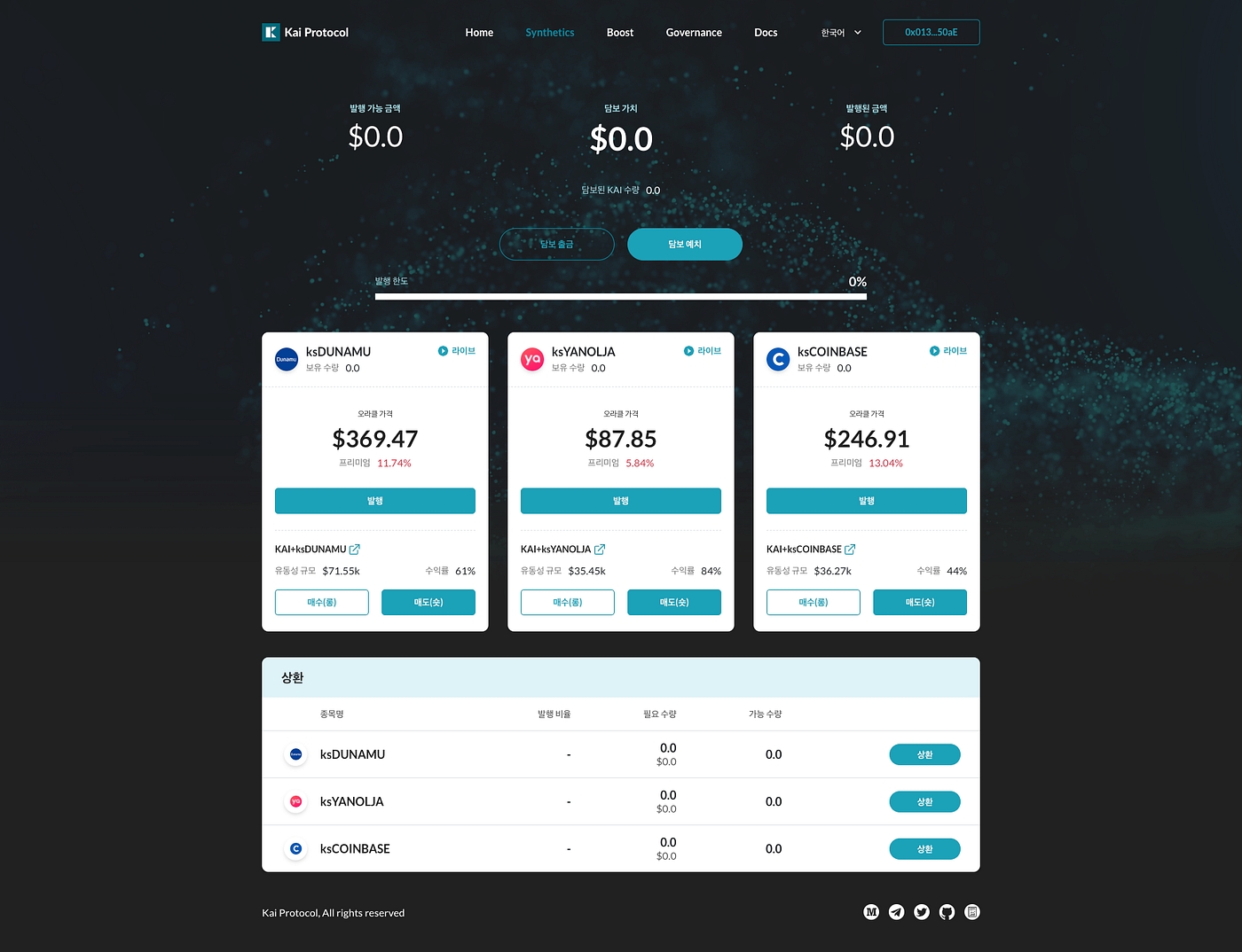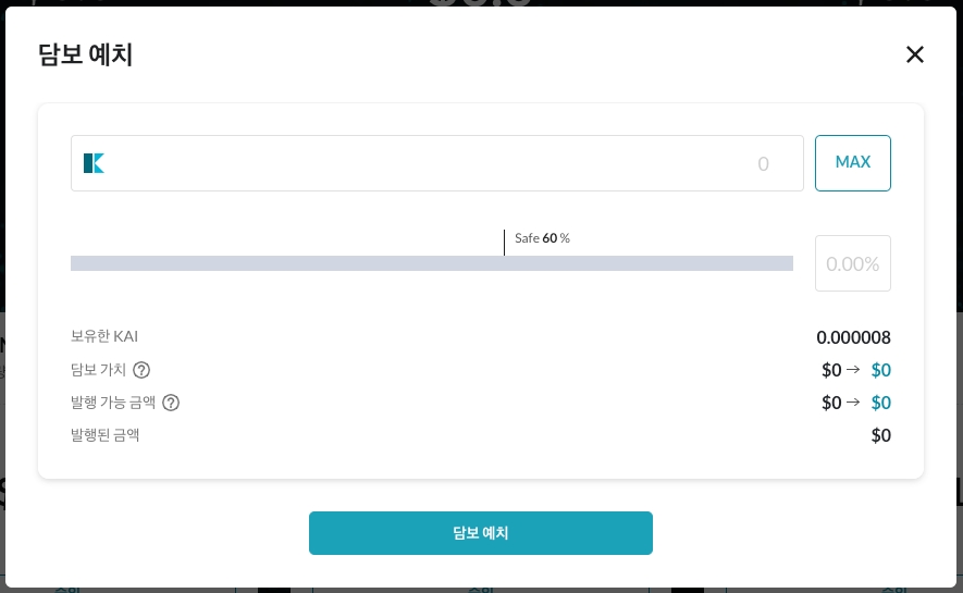 KAI를 담보로 예치하면 수량과 가격을 토대로 특정 비율에 따라 합성자산을 발행할 수 있는 발행 가능 금액로 전환됩니다.